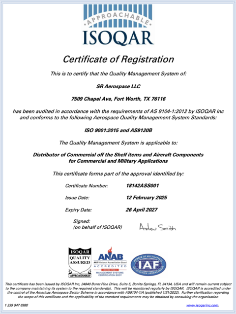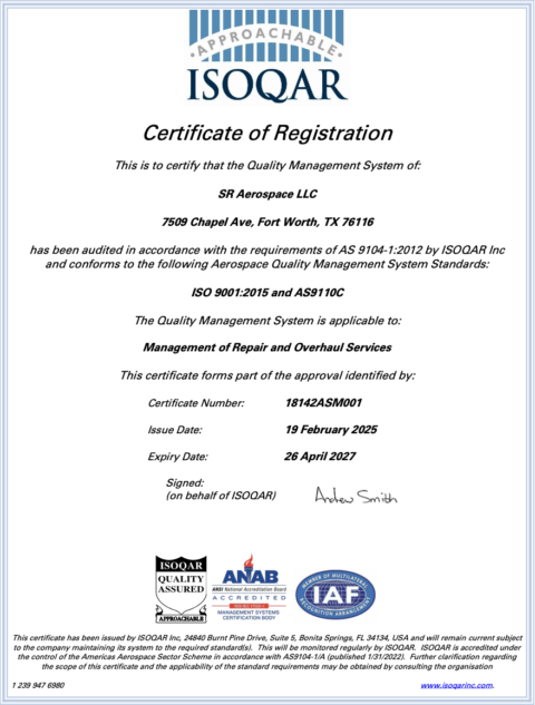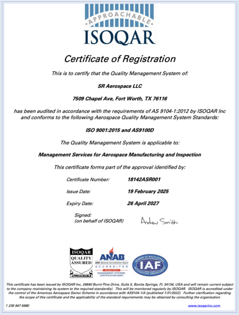 SR Aerospace is an AS9100, AS9110, and AS9120 certified business. We are committed to providing Quality Parts, Repairs, and manufacturing management.